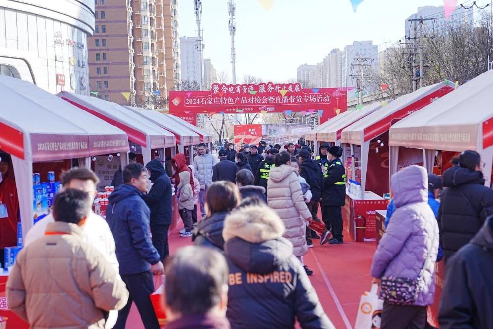 活动正值年货采购期,对接会现场石家庄县域特色农产品、日常消费品、文创产品、非遗老字号等众多参展企业竞相亮相,带来了琳琅满目的特色产品。石家庄双鸽圣蕴食品有限公司的双鸽老红肠、石家庄川越食空渝乡辣婆婆的辣酱、河北省蜜老头蜂业有限公司的百花蜜、石家庄洛杉奇食品有限公司的香卤鸭争相被人们品尝;河北宫牌酒业有限公司、河北红色窑洞酒业有限公司、河北高速燕赵驿行中央厨房、石家庄桥西区西巴客糕点店的展位前人头攒动;河北禾趣科技有限公司的云轻精铁炒锅、河北至喜科技有限公司的觅所百褶裙珐琅系列深受老年参会者的喜欢;华北制药河北华维健康产业有限公司的保健产品、君乐宝乳业集团股份有限公司的简醇酸奶、河北枣能元食品有限公司的红枣果肉等健康饮品则得到了上班族的追捧。